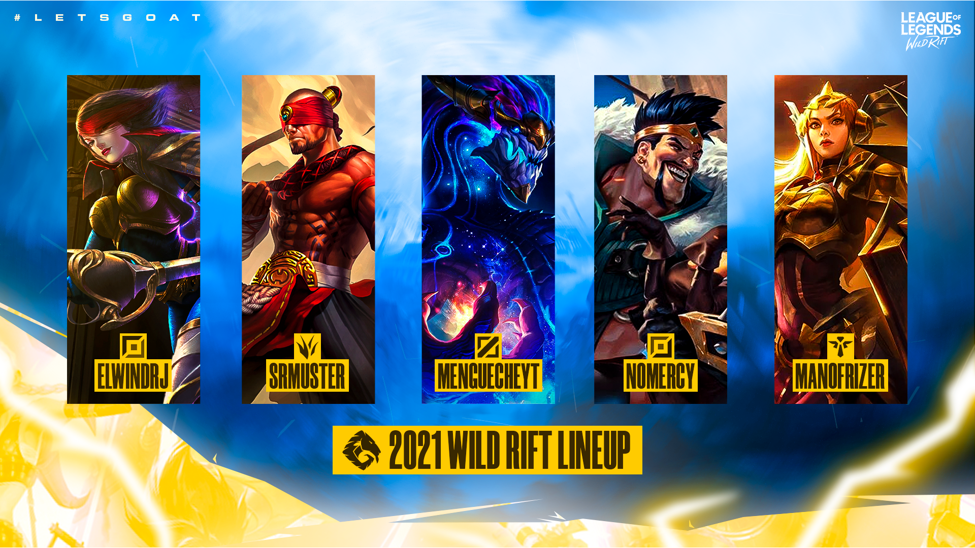 A GOAT é uma equipe lançada pela Outplay Company para disputar campeonatos no novo jogo mobile League of Legends: Wild Rift. O time chega com uma line-up muito experiente no cenário de MOBA mobile, contando com jogadores que inclusive já foram muito premiados. ElWindRJ; SrMusTer (campeão Latino Americano de 2020 no Arena of Valor); Mengueche; NoMercy (eleito pelo Prêmio Esports Brasil como melhor jogador mobile do ano 2018) e ManoFrizer.
